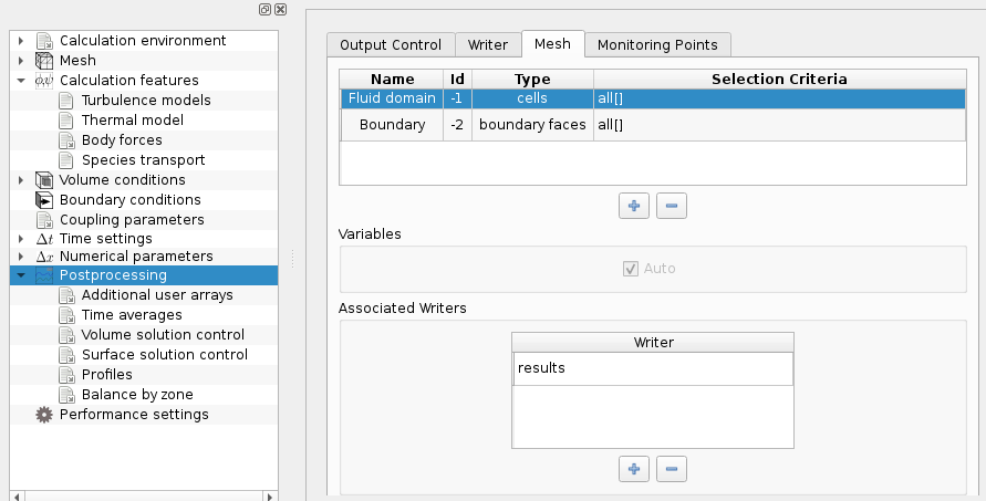 Also, the "auto variables" flag may be assigned to additional post-processing meshes so that output of fields behaves in a manner similar to that of the default post-processing mesh in the same category (for example the main volume mesh for a volume extract).