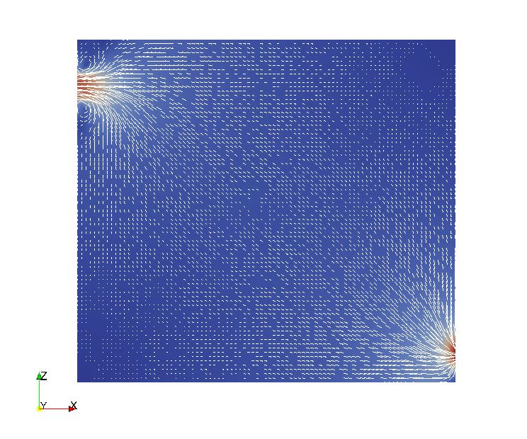 I have a mass flow balance issue in a simple case. My mesh is hexahedral and regular. I put an inlet condition for a number of boundary faces on the up left of the domain and an outlet condition for an identical number of boundary faces on the down right of the domain (see associated picture cas.jpg, color what you see is velocity).