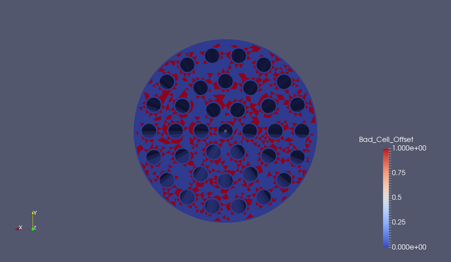 Please find pictures of the mesh and listing file which might help to better explain the problem. I should also mention that changing the mesh to prismatic (first meshing the base-face and performing a mesh extrusion ) would not work in my case as later on I would like to deform the fuel pins thus they would be criss-crossing interior of the domain.