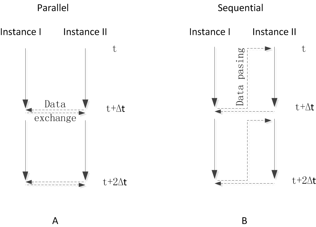 And how the PLE library works, in the way of A or B as shown in the following picture? If it works in the way of A, how the data is exchanged between CPU cores employed by different code, using MPI?