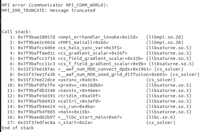 I came across a problem when I tried to call the 'call field_gradient_vector(ivarfl(iu), 1, imrgra, inc, gradv)' or the pressure gradient in a subroutine that I build up in the cs_user_module.f90. For some reason it works fine when I use 1 processor. When I switch to more, I get " MPI error (communicator MPI_COMM_WORLD):