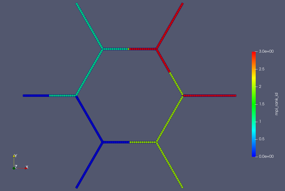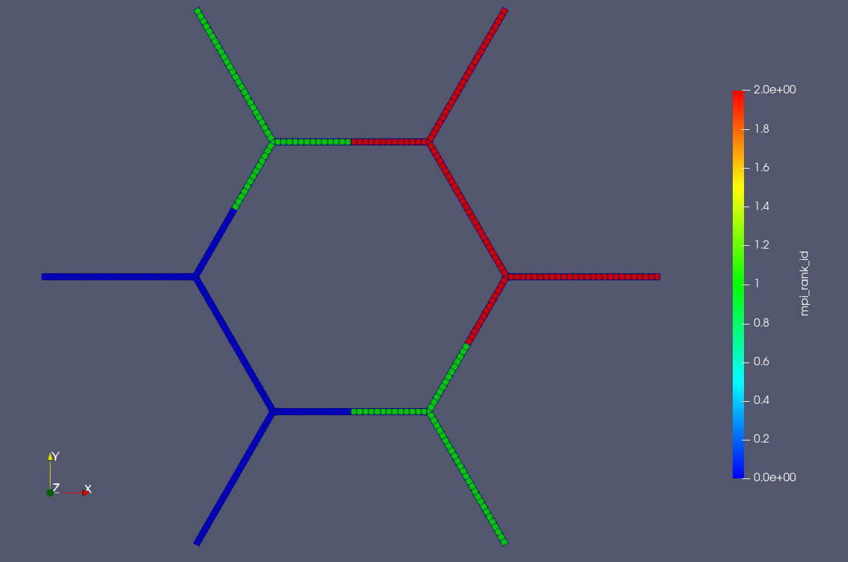 I join you here the MPI rank IDs within the same geometry for 3 and 4 processors. In the last case, it seems that the geometry is not symmetrically cut which may explain the problem.