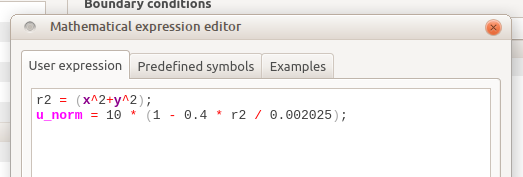 I used a "Norm (User law)" for inlet BC, producing the same law written in tutorial pdf; attached two snapshots.