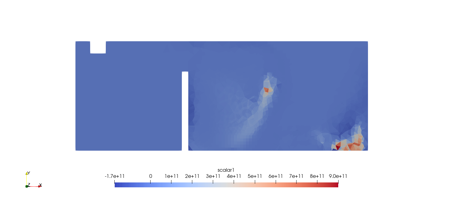 And finally the scalar magnitude become divergence like 1.0e10 and -1.0e10 in almost all over the cells as can be seen in next post.