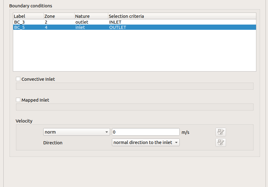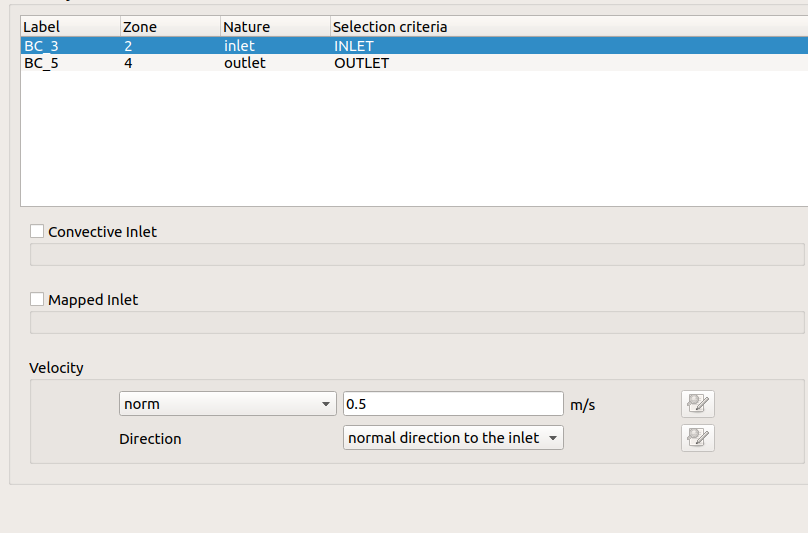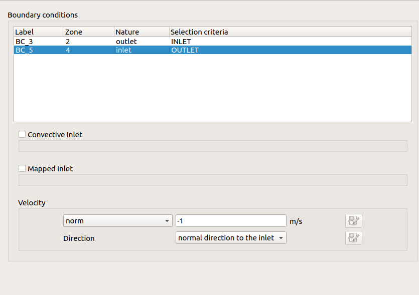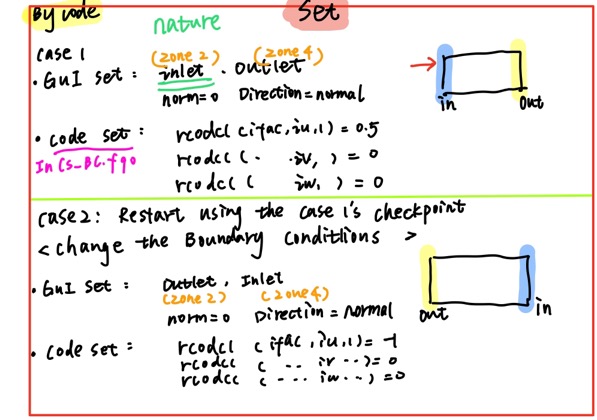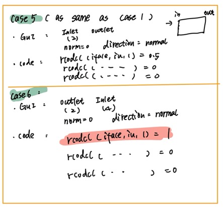 for example, in the first case 1, I set the inlet(criteria INLET) and outlet (criteria OUTLET). in GUI, i first set the normal direction and the norm=0, and then the velocity =0.5,0,0 is set by code [screenshot 2 and 22], and then I change the boundary conditions as the case 2. the inlet's criteria are the OUTLET( these criteria just the define during mesh generation, , and this change has done in GUI,norm=0, the direction is the normal ). in the code, I set the velocity = -1,0,0. [screenshot 3 and 33]