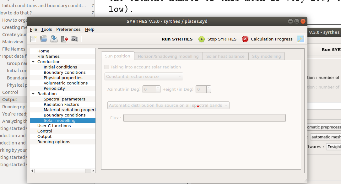 Hello, i am using Syrthes V5.0. I noticed that in the radiation options there is this solar modelling function bar, yet it's always grey and i could not enable it anyway. Like is shown in the attached screenshot. Can anyone kindly tell me how i can enable this function? Or is it not yet fully developed therefore still unavailable so far? Thanks in advance.