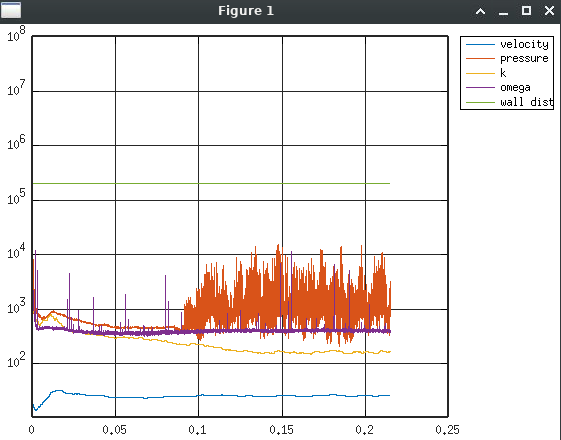 Despite numerous runs and changes in the setup, this issue persists to varying degrees. Starting from a uniform velocity initial condition, this checkerboard does not appear initially, and the residuals are smooth (without significant oscillations). When the vehicle wake reaches the 1:2 mesh expansion near the outlet patch, the checkerboard starts to form, and pressure residuals begin to oscillate (see image 2; don't mind the oscillations seen in the omega variable; that was resolved with others advection schemes easily). This persists over time and even becomes more pronounced, though the simulation does not diverge or abort.