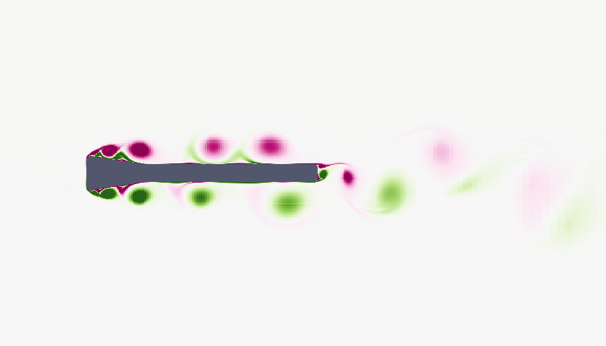 I am currently studying the flow-induced vibrations of hydro power plant trashracks. One part of that study is a numerical investigation, modelling the problem in 2D. I already got some results for the flow pattern around a trashrack bar, using Code_Saturne at a Reynolds number of about 5000 with the turbulence model "Rij-EBRSM". This is how the vorticity looks like : Now I would like to let the bar move, using the ALE module. This way I would access the frequency of vibration for a given mass and stiffness. I could thus determine e. g. the added mass.