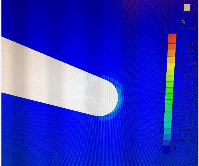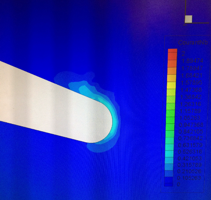 However, the velocity and CFL number blow up after several hundred steps even if I set the time step as a very small value. I attached the CFL contours of 100, 200 and 300 time steps, after that the velocity diverged from the near trailing edge zone. I think this is probably a initial flow behavior of a circular trailing edge aerofoil, because I used same settings to a sharp trailing edge aerofoil and it runs fine.