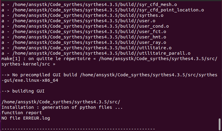Ideally I would like to install the 5.0 version. Nevertheless, I try to compile the syrthes 4.3.5 version with your python file, there is some progress but the installation fails now when building the GUI. In the log, there are some message from the mkdir command: "mkdir: operande manquant"