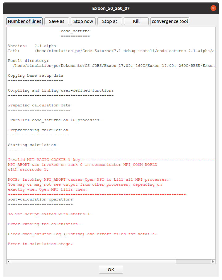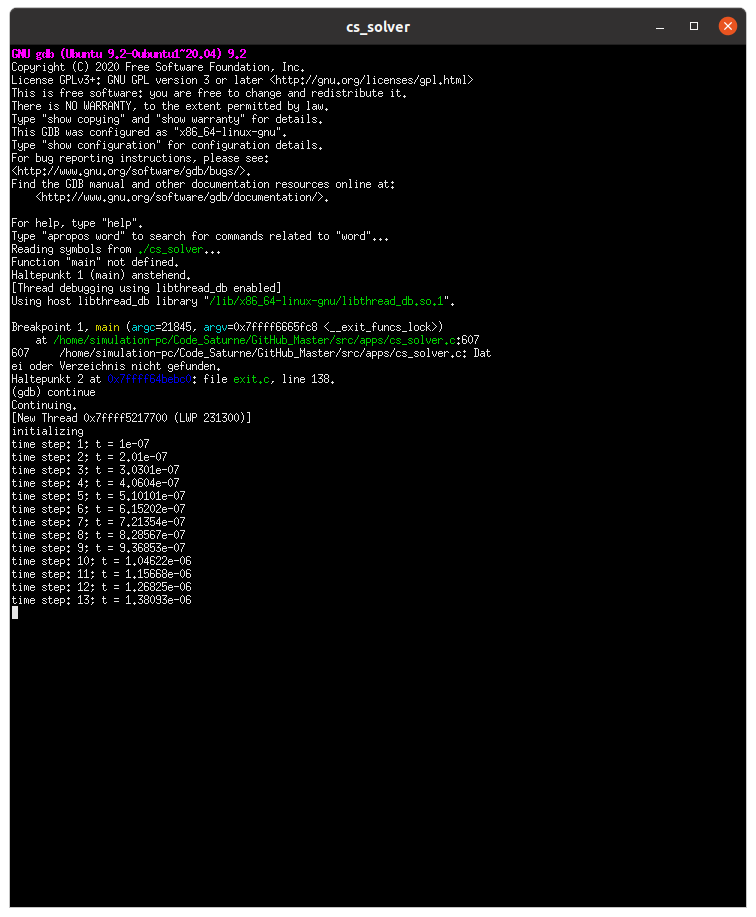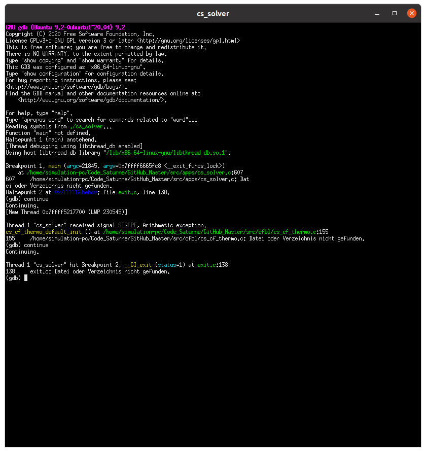 here is the output from gdb. So is the "interesting line" number 155? I have never used gdb before. The German message is "File or directory not found" and refers to the cs_cf_thermo.c. The interesting thing is that the folder "GitHub_Master" was my source folder, which I already deleted. However, the main calculation runs fine without the stiffened gas model (see gdb2).