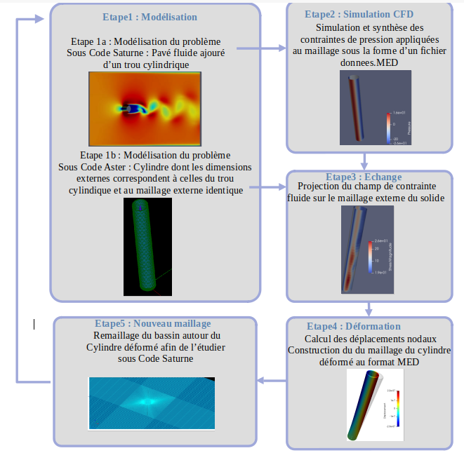 At this point i manage to obtain the displacement on the structure using code aster. I have created a med file incluing the distorted shape. At least i have to import it in code saturne : So i need to build the cubic mesh standing for fluid flow, and substract the distorted shape (step 4 to step 5)