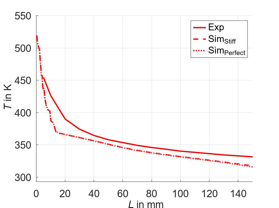 as announced I have done a calculation run on a single operating point of our nozzle. You can see three different curves of velocity and temperature below the nozzle tip. They are the experimental data, the calculation data with the perfect gas model and the calculation data with the stiffend gas model.