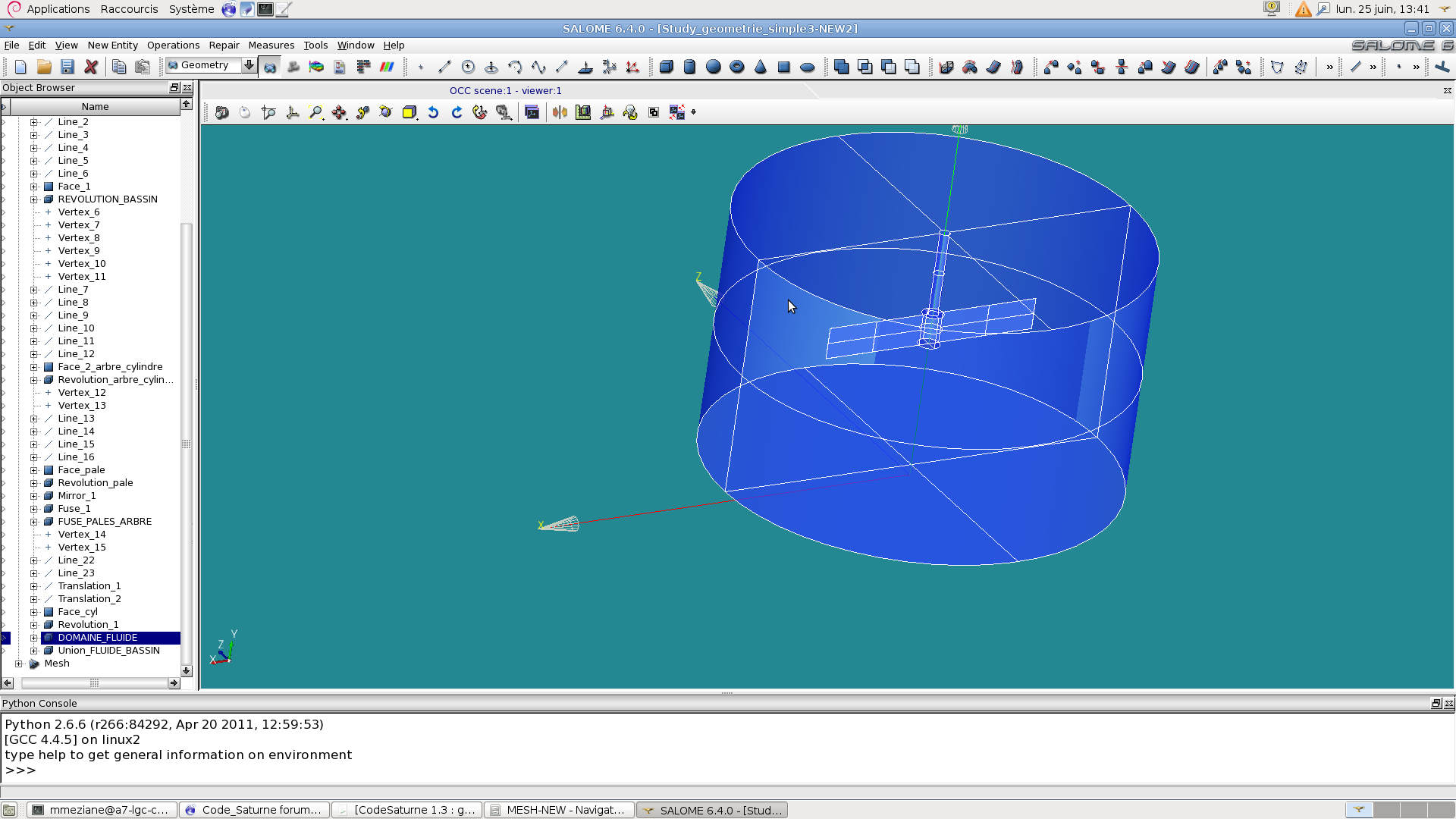 IN saturne I cheched my mesh. "Med" then I chose the menu "periodic boundary" I chose "periodiqc and rotation" I gave the value 360° to "corner" then (Dx = 0, Dy = 1, Dz = 0) as the fluid turns around the axis Y. stationary mode.0