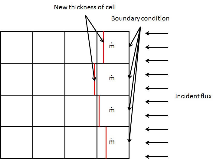When the thickness loss becomes higher than the thickness of the first cell, I change the thermal properties of the cell from those of the material to those of the air. I desactivate the incident flux at this boundary condition and I have to create a new boundary condition at the position of internal face.