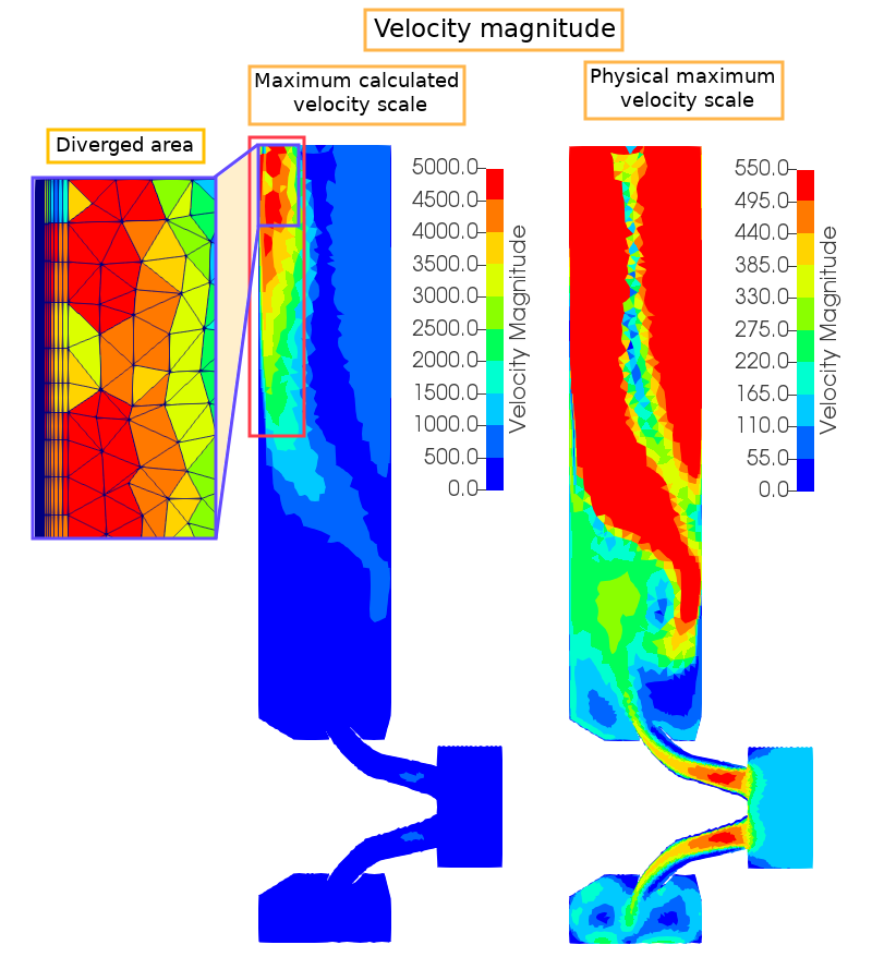 As an example I attach the picture with diverged velocity field if GT snail duct. You can see that the mesh is not good in prism-tetra transition zone but it's near impossible to have this transition ideal in practical cases. In the snail itself velocities rise up to ~500 m/s that is correct (I compared to CFX that is our mainstream tool at work). But, as you can see, velocity becomes unrealistic high at the top part of the duct and it will never converge with "usual" simple settings.