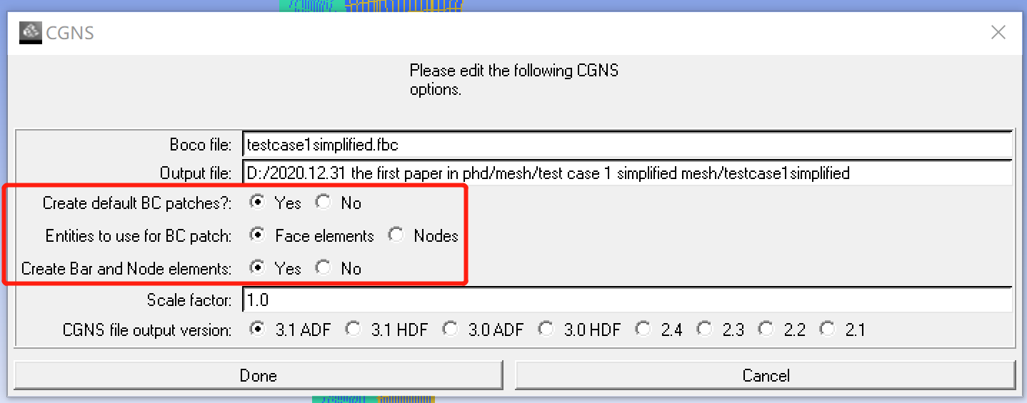 1. When export mesh from ICEM, I changed three options from default to: "Create default BC patches-Yes", "Entities to use for BC patch-Face elements", "Create Bar and Node elements-Yes", see the figure below. Is this correct?