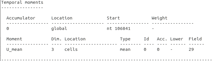 Then I tried to use the user subroutine "cs_user_parameters.c". I referred to the example from "cs_user_parameters-time_moments.c", but without success. I didn't get the time-averaged results in "postprocessing" folder. But in the setup.log file, I can find "U_mean", what I added in the subroutine. So I am confused about what I'm doing wrong.