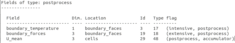 Then I moved to the next step, trying to get the time-averaged values for variables on boundary faces. My final aim is to get time-averaged thermal flux values for heat transfer prediction. As I didn't find "thermal flux" in "post_vis" in setup.log, I suppose thermal flux is calculated by yplus, tplus, temperature, etc, not calculated directly by the solver.