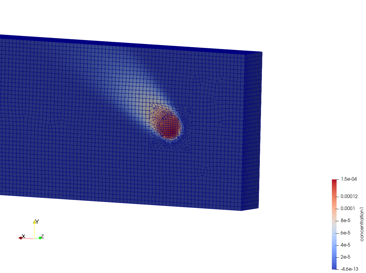 The flow simulation gives satisfactory results. Nevertheless, it seems that the dispersion case does not match the boundary condition at the source. Indeed, the simulation tends to underestimate the value I impose with the boundary conditions by ca 90%. Such a value is not even reached in the overall domain. Besides, the concentration profile at the surface is not uniform.
