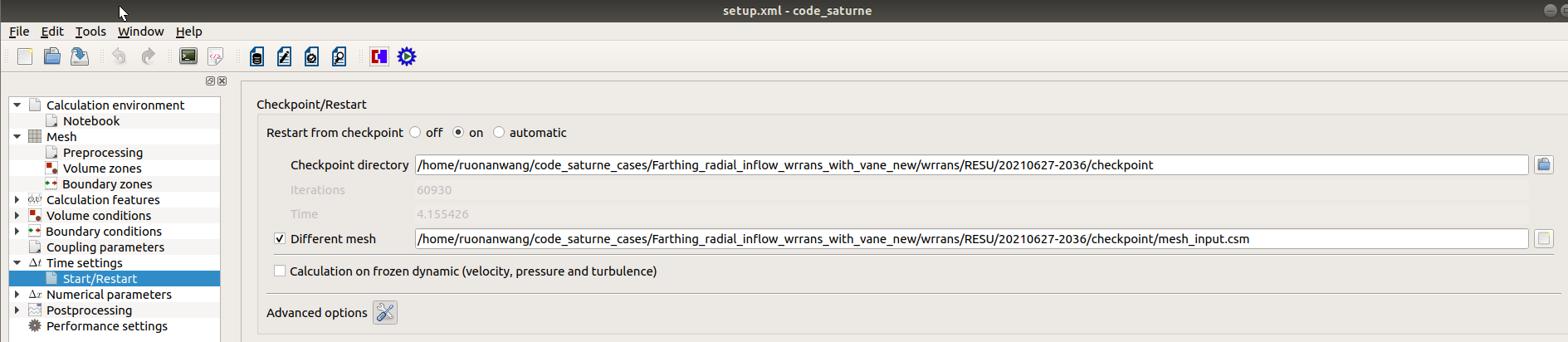 Another thing need to mention is that, the previous RANS mesh is coarse, and the current LES mesh is refined. But the CFD model is the same. So I ticked the "Different mesh" box, and choose the .csm file from the previous RANS checkpoint folder. Also, in "Advanced options", I didn't tick the "Read the auxiliary restart file" box.
