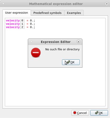 I am stuck everytime I use the Mathematical Expression Editor, I get an error message "No such file or directory" when I click on "OK" (even if I change nothing). I have this issue for initialisation, and also when I tried to use Postprocessing profiles.