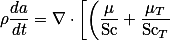 }{\partial t} + \nabla \cdot (\rho a \mathbf{u}) - \nabla \cdot \left( \left( \frac{\mu}{\text{Sc}} + \frac{\mu_T}{\text{Sc}_T} \right) \nabla a \right) = S_{T_a} + \Gamma a_{\text{in}}