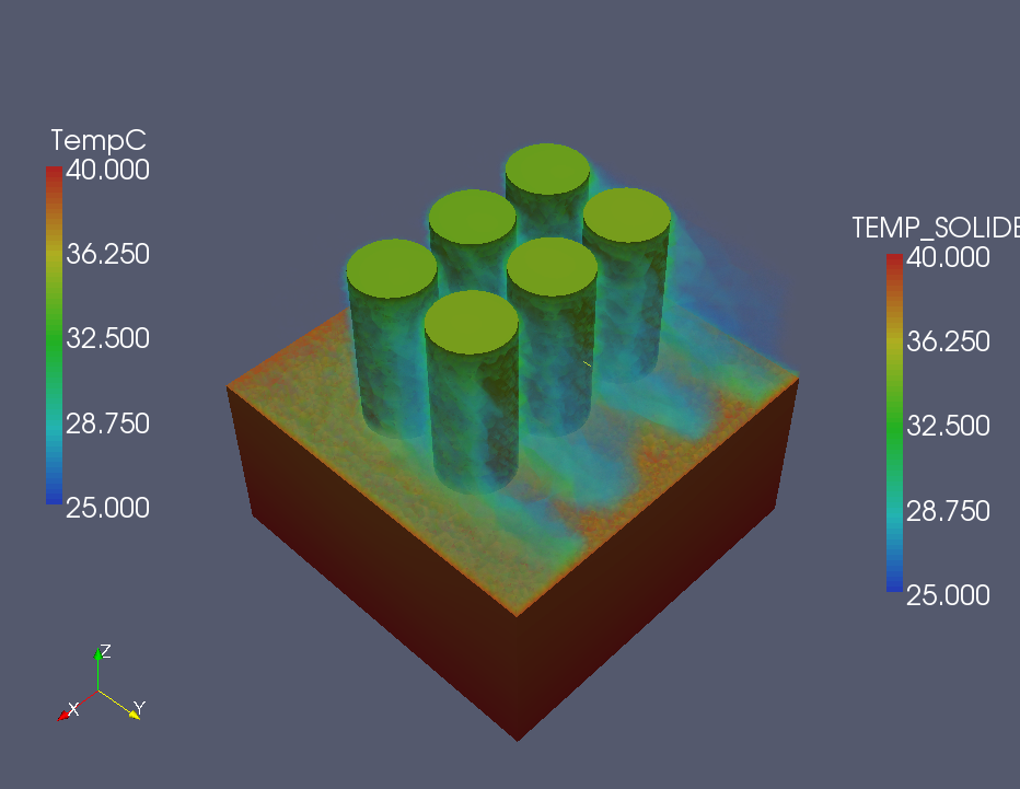In return for an answer, a pretty picture of 25C air flowing over 40C pins - BCs for bottom of pins part: Dirichlet 40C, thermal flux of 0.002W/m^2